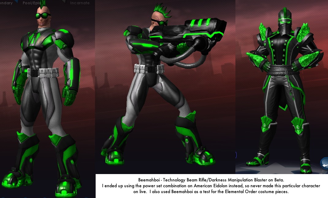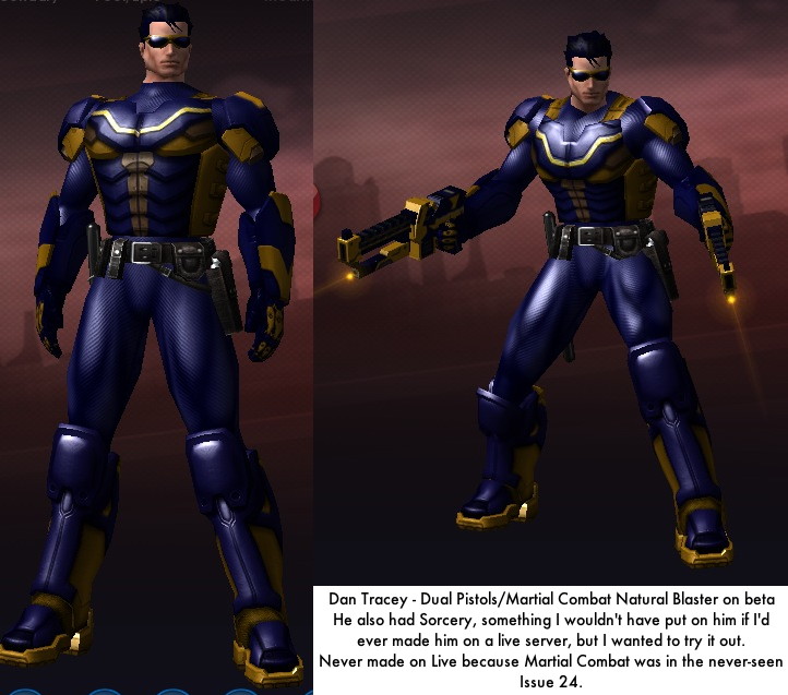 | Costumes 1 and 2 | This guy pulled triple duty. Not only was he testbed for new Primary and Secondary powersets, he was also a clothes horse (both costumes use piecs that were new in beta at the time) and I ran him through all the First Ward arcs solo. I guess that might be part of why I never made him in live, I was kind of tired of him by that point! I did use the power set for American Eidolon, though. He's also kinda rare for my beta natives in having a pretty fleshed out background. | ||||