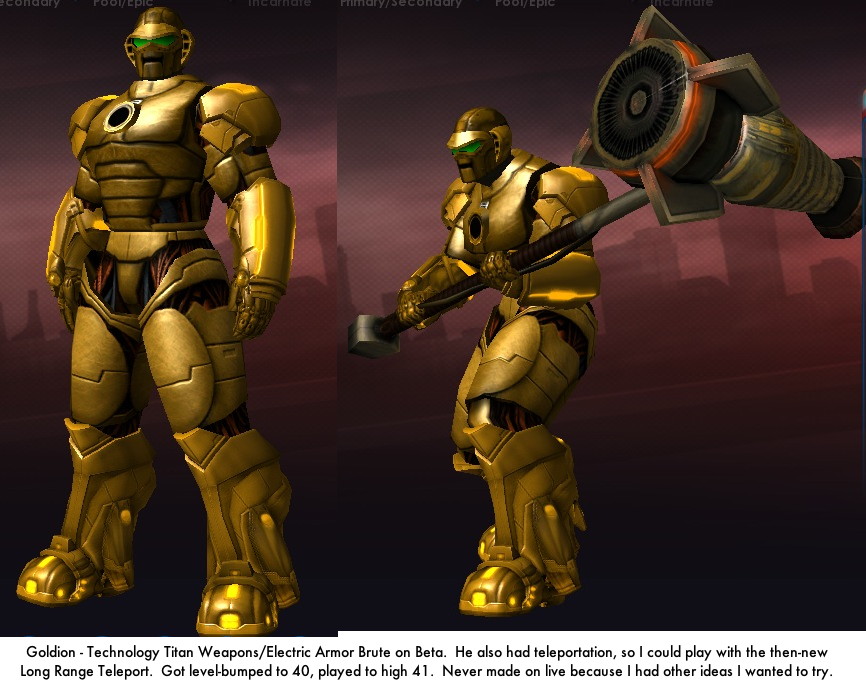| Costume | This was made to try out Titan Weapons...and when I saw the Rocket Hammer I knew who I needed to make. Goldymarg, wielder of the Goldion Hammer, from Gaogaigar. Of course, I also wanted to play with the new Long Distance Teleport power, so his build ended up being pretty awful and I had a devil of a time getting him through the L40-50 arc for I24 later on. He did use other costume slots, but only to model other weapons. The reason he didn't go live was that I had other ideas I wanted to try by the time Titan Weapons came out. Ironically, the Titan/Elec combo did end up working pretty well for me on Mobile Suit Gangnam. | ||||