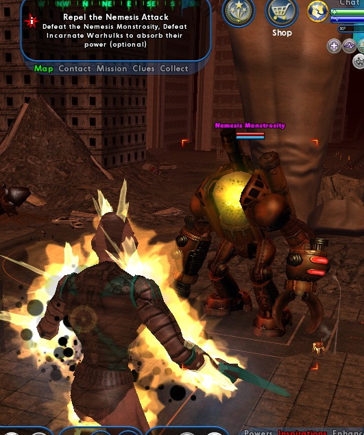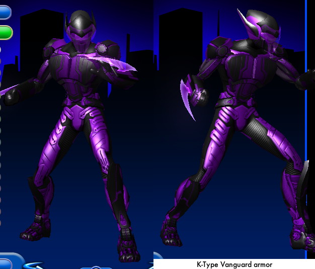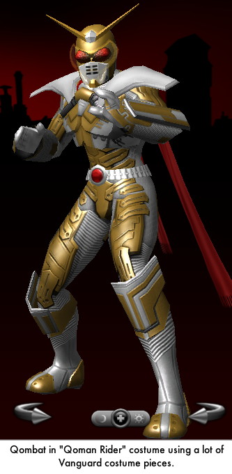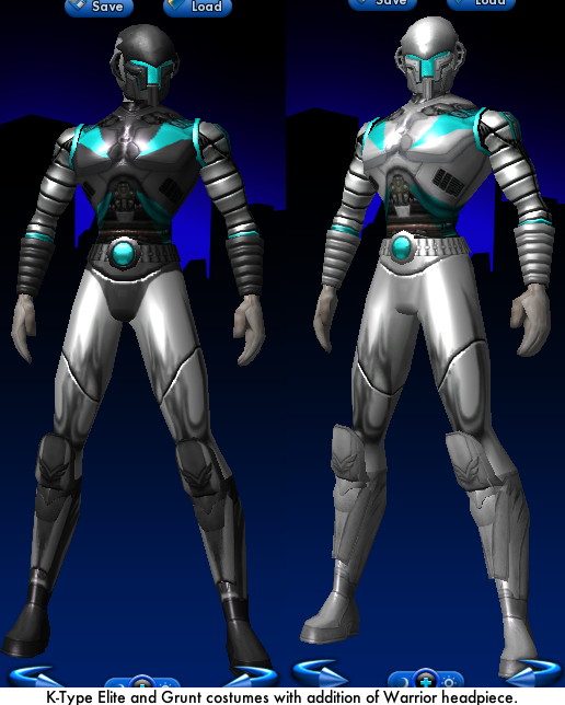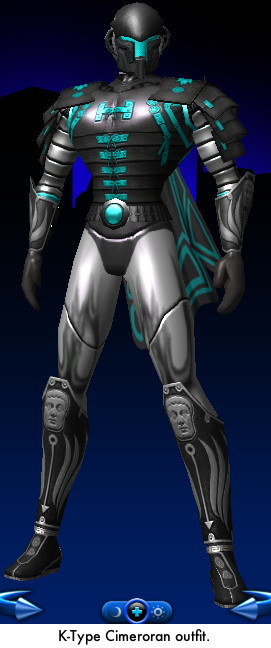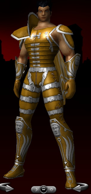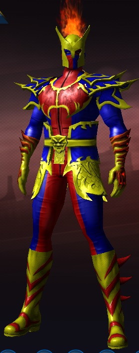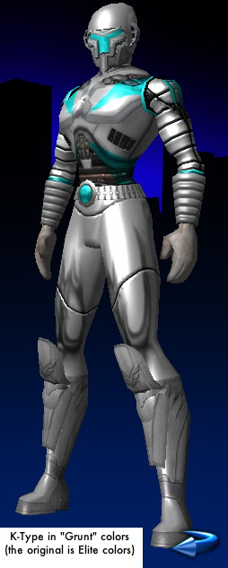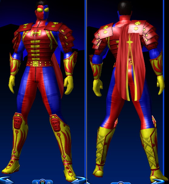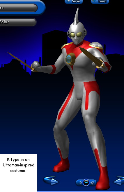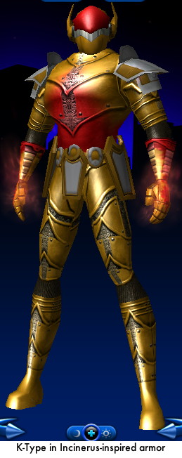 | Costume 1, Costume 2, Costumes 1 and 2 with tweaked helmet, Ultraman-inspired costume, Incinerus-inspired costume, Vanguard suit, Roman armor. | A friend started playing on Triumph, so I made K-Type to help teach him the game. This design is based on the S-Type and C-Type Shinobis of Monsterpocalypse, a Katar-type. I briefly considered a Zor K-girl, but they all have distinctive blades I wouldn't be able to imitate. He laughs at gravity. Also, he can haz pumpkinhead. His second costume is patterned after the "Grunt" color scheme for Shadow Sun figures, where the original is based on the "Elite" units. Incinerus is a "monster" from Monsterpocalypse from the Elemental Champions faction, a monk that can turn into a giant flame avatar. I had to do the cape mission in order to unlock the Aura mission so that I could get the flaming fists. I decided to move him to Vigilante in keeping with the morally shady side of the Shadow Sun Syndicate. Spoilery pictures of him from the end of Who Will Die? Part 7: 1, 2, 3. He's also one of the high level characters I took to Beta to try out new content, like the never-released Brass Tuesday arc, in which he fought the Nemesis Monstrosity. | |||||