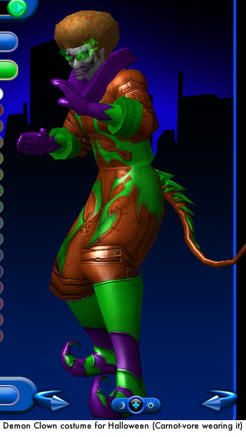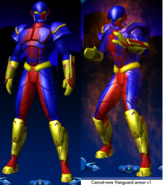 | Costume 1, Demon Clown outfit, Sliderman outfit, Vanguard suit, Roman armor, Incarnate togs. | One of my oldest superhero ideas is a guy in primary colors with fire and ice powers. He's been through a lot of names (all of which are taken on all servers, naturally) and a lot of power sets (including a version with light and dark instead of fire and ice). Sadly, the 50/50 pattern isn't available on torso or legs, so I couldn't quite capture the original look. And I ended up going for a pun in the name (Carnot was an early thermodynamicist, and a Carnot Cycle is one of the idealized heat engines). So he's not all that closely related to the original character, but it's not like I've done much with the idea lately anyway (he got way too Gary Stu by the time I was in high school). The Demon Clown is something I made up for Halloween 2010 as a generally scary thing I could slap on any male character but I used Carnot-vore to build it. Similarly, Sliderman is a gag costume and Carnot-vore had a spare slot. I later filled Sliderman's slot with the Vanguard armor, and unlocked the fifth slot to get Cimeroran togs. One of the very few characters I hit 50 on after the announcement of the game ending, but I did get a dingpic. | |||||