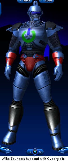 | Costume 1, Stallion White disguise, Costume 1 adjusted | Based on Mic Sounder the 13th from GaoGaiGar. Both Sonic Attack and Mental Manipulation involve a lot of rings in their FX, so I gave every power a different color mix, to represent his light show. Instead of going with the Cosmo form, I decided to make his second costume an approximation of Stallion White from Gaogaigar, call it a holographic disguise. After getting the Cyborg Pack, I tweaked Mike's main costume. | |||||