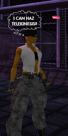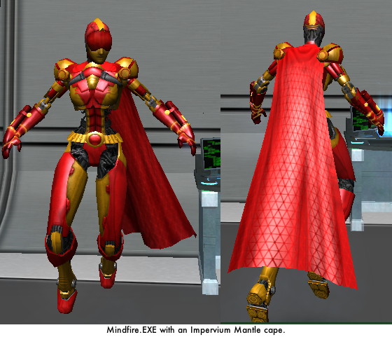 | Original Body, With Cape | I made this up on the spur of the moment because most of my regular supergroup on Sunday nights was unavailable, and the few who were there had just started characters on Triumph. So, rather than get the group's main team of Praetorians all out of whack, I made a new character on short notice, grabbing a few elements I liked from the Praetorian setting and slightly modifying a costume I'd created for someone else. After the evening's play, I went back and made more significant changes, so it wouldn't look like I was ripping off the previous idea. :) Although that didn't stop me from slapping the Impervium Mantle cape on her to match the one her "protoform" modeled in the trailer for the Origins Pack. Mindfire.EXE is an emo Clockwork, acting out because daddy Neutron didn't show her any love. | |||||