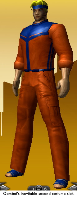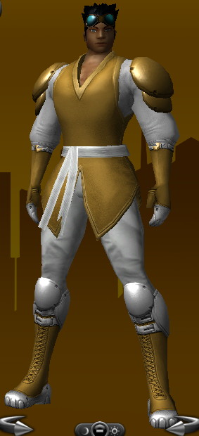 | Costume 1, Rogue Isles Disguise, Vanguard Armor, Villain Group suit, Roman armor, Clubbing outfit. | My first Praetorian character, woot! I was tempted to make the outfit a more blatant Naruto riff, and gave in to the temptation when he chose a costume that would let him blend in on Primal Earth. He's based loosely on Kombat from my Modern Knights setting (see here for some other interpretations of Kombat), but the name Kombat was unsurprisingly already taken. Once he hit L20 (and celebrated with the Emperor) he went for the Rogue Isles and started working on shifting to the Rogue alignment. He's not really evil, just a bit self-centered and raised to think that might makes right. Why not make him a Brute? Well, I like the Scrapper class-ability (improved critical hits) better than Rage. His Vanguard Armor is meant to be a Kamen Rider homage, while the VG suit is inspired by Domon Kasshu of Gundam G-Fighter. | |||||