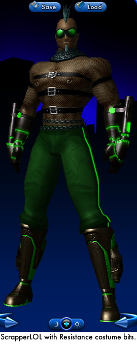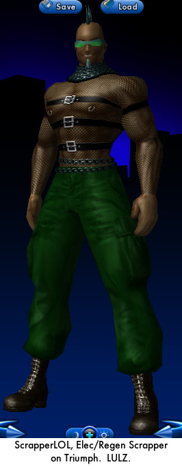 | Costume 1, Warez added. | While playing K-Type, I meant to comment on the dangers of "scrapperlock" (a tendency for melee characters to lose track of everything around them), but due to a weird typo it came out "scrapperlol". So I decided that I needed to make a reformed Freakshow by that name. Once I came back to him after playing a bunch of Praetorian content, I decided to upgrade him with 'warez' acquired from the new Praetorian immigrants. Not shown is a transitional costume with just the rocket boots costume piece added. | |||||