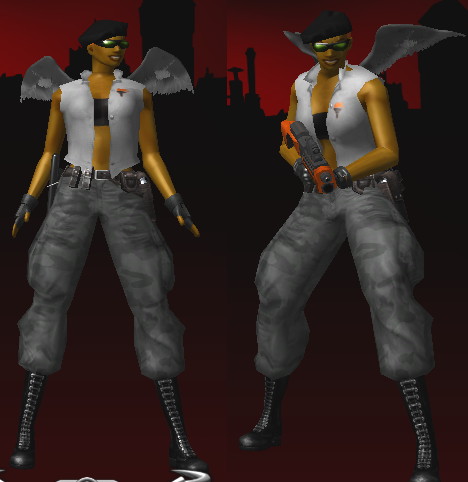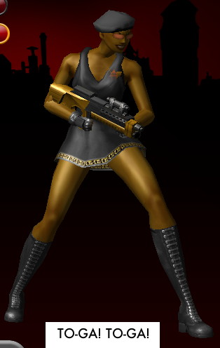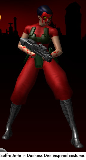 | Costume 1, Now with wings, TO-GA!, Duchess Dire homage. | Mainly made to be a leveling pact companion to a Ziggy Stardust pastiche character. It was that or a diamond dog. During the "Drop off canisters of Outbreak" mission, she had to go to Boxhab. She also has apparently developed a startling new power. Oh, and while rocket boots would certainly make more SENSE for her to explain the flight power, I found the Cherub wings and decided to use 'em. She ripped off the wings of a pigeon and spliced them on, maybe? I got her a toga by beating Snaptooth in the Spring Fling event, but she's a little fragile for those missions and died a lot in the attempt. Duchess Dire is the lone female villain from the Spiral Zone cartoon from the late 1980s. | |||||