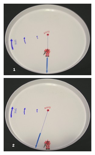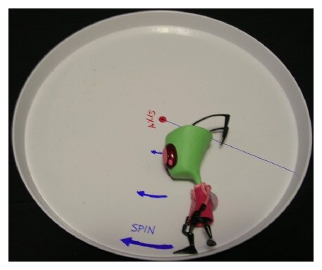robot has drifted "spinward" during his jump. Notice, too, that his head is