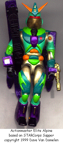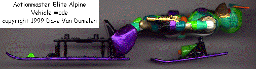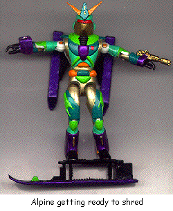 Alpine was part of a mission to the ice planet Kryos to find a cure for the side effects of Nucleon, when his ship crashed in the snowy peaks. He volunteered to submit to Nucleon repairs in order to get above the storm and call for help. But something about the unique radiation of Kryos allowed him to retain part of his ability to transform, putting him among the Actionmaster Elites. He prefers to patrol in mountainous areas, where his skicraft mode is more useful than any other ground craft and less susceptible to the high winds than an aircraft. In either mode, his wrist-mounted cryoblaster can freeze opponents in their tracks, plus he's learned to use it to either cause or prevent avalanches. His skis contain antigravity circuits that allow him short bursts of weightlessness. Aided by a small jet motor on his back, he can make controlled leaps of up to two kilometers. Or as he puts it, "wicked hang time." His front ski is made from duralloy and can be used as a shield in robot mode, or to slice through metals made brittle by the extreme cold of his preferred haunts. He can even ski on it. His garish colors make him stand out on the slopes, but he wouldn't have it any other way.