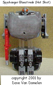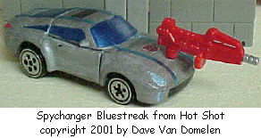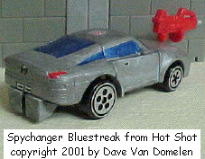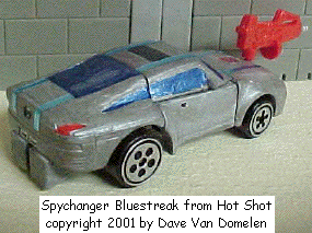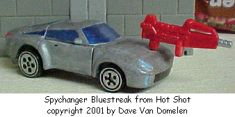 For the paint job, I decided to go with a risky scheme, the coloring trick I'd used on my previous Bluestreak kitbashes and decoys. An underlayer of light grey, then a thin layer of gunmetal to get that flaked metal silver look of the original car. The end result was a bit more mottled than I'd like, unfortunately. I painted the gold rims of the wheels silver to match the overall scheme, and made the underside mostly black and metal-flake effect, with some pen work on the boots. As with Trailbreaker, I was careful to paint around the Autobot symbol, so I wouldn't have to make my own. I left the glowing eyes effect in place, as seen by the nifty effect I got from putting a laser beam on his head.