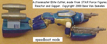 I was inspired by some cheap boats at a dollar store to make a boat Actionmaster Elite. However, finding the appropriate parts involved a search of a half dozen dollar stores. I settled on the rear points of a zodiac-style inflatable boat for the arm pontoons and hacked up a measuring scoop for the legs. I used a lot of putty to attach the hydrodynamic shapes to the figure, and added BBs (the kind that come out of an air rifle, not the kind that says "Roger!" in BWII) to the feet to give the figure more stability. Then followed a lot of shaping, and I discovered two things: one, some of the BBs were too close to the surface, and two, a Dremel sander can sand down stainless steel BBs. Heh. Once the floats had been properly shaped, I made the rear thrusters from Lego pieces and glued them to the boots, the idea being that the thrusters would keep the legs linked together in boat mode. For guns, I cut the grips and clips off a couple of submachineguns that came with Mortal Kombat figures. Finally, I added a cockpit to the back with putty (it started as a big lump, then got cut down to shape and the inner part hollowed out) and glued another googly eye to the chest to act as a spark crystal. As a last bit of fiddling, I flattened some areas on the rounded faceplate to be eyes, and filed a slit for a mouth.