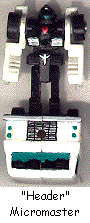 Now I needed a color scheme. The figure was made from off-yellow plastic, so I needed to incorporate that somehow if I wanted to keep the joints usable. I also wanted a scheme appropriate to a good name. Then it hit me. The Columbus Crew, our Major League Soccer team, had just started its season. Their colors are black, yellow and white, which matched both the color of the base figure and of the Zord legs (which I couldn't completely paint over, due to moving parts). So he would be...Guncrew! The pattern of the color scheme was inspired by "dazzle painting," a camoflage method used to trick submarines in WWI, although it didn't quite turn out as I'd have liked. Still, it does consitute camoflage in a setting where the main light comes from weaponfire...he looks like a random bunch of shadows cast by shellfire bursts. For some continuity of design, I took the pre-existing pattern on the toes of the Zord legs and applied it to the fingers of the figure. I also painted an Autobot symbol on the Micromaster's back, but it's metallic red paint and didn't show up well in the scan (reflected all the light away from the scanner lens). Speaking of the Micromaster, it needed a name too, and I decided on Header, which is a multi-level pun (engine part, the fact he's a Headmaster, plus a soccer in-joke).