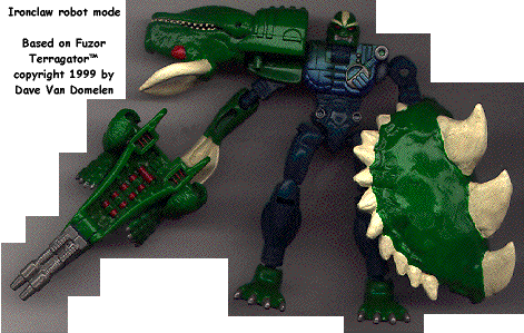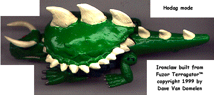 Ironclaw, so named because the original hoax-critter had claws of real iron, remains fully poseable and transformable. A coat of nail polish topcoat on some of the softer paints helps in this, although the green paint is durable enough on its own.