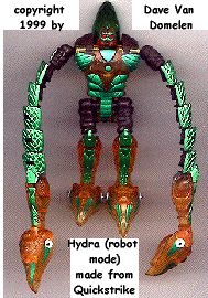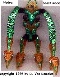 The calm and collected Hydra is nonetheless emotional enough to appreciate the irony in his new body. In robot mode, all four of his extremeties are lethal biting weapons, and his elongated arms often surprise opponents who were sure they were out of reach. He has developed a fighting style that keeps him bouncing around the field of battle, rarely having more than one foot or hand on the ground at a time. In beast mode, however, he is practically immobile, able to slither along at only a few meters per second. The reason is that all of his energy is shifted from mobility to offensive firepower. His four heads not only have powerful jaws, each spits a different vile substance: napalm, cryo-fluid, acid and a sort of caustic glue. In robot mode he can sometimes bring out one of these attacks by focusing his concentration, resulting in a flaming punch or searing kick.