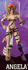 The next step involved cutting things, including (accidentally) myself. As you can see, Angela has one huge boot and one skintight boot, but Rapture has two leather boots. (Oh, as a side note, the actual Angela toy didn't have anywhere near as much detail painted on it as the picture to the left shows.) So I carved the large boot down to size with an X-Acto (well, I started with a pocketknife, but after slicing my thumb open decided to get an X-Acto) and built the other boot up with structural paint. Then I took the big shoulder pads that I'd removed and cut/sanded them down to size, attempting to make them symmetric (Todd McFarlane seems to have a beef with bilateral symmetry). Next I build up her hair and the front of her costume with more structural paint. The costume buildup was because Rapture's top isn't totally skintight, and the bra-less Angela's front implied skintight costume. Next, because I knew I'd never get the paint to stay on elbows and knees if they were allowed to bend, I glued those joints straight and added structural paint to fill in the cracks. Finally, I did a lot of sanding and slicing to get details to work better.