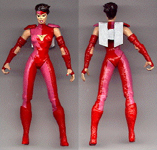 With the structural work done, it was time for the painting. The coloring of Rapture's costume was very inconsistent in the comic, so I decided to stick with what was used on the cover of Transformers #73. In the process of painting, I found a few of my structural elements had flaws, and added bits to her costume to compensate. The Pro-Doh forehead absorbed paint differently and stood out, so I turned that area into a headband. And a fleck of structural paint down in the figure's cleavage would be too difficult to remove without damaging other areas nearby, so I painted a pendant over it. Additionally, the figure's gloves couldn't be completely modified, so I painted the hand straps red to match the rest of the gloves. For the hair, I painted it solid brown, then drybrushed on black and later more brown to give a more realistic look. Unfortunately, this shows up on the scans as black hair. Oops. When all of this was done, I glued the jetpack on and sprayed the whole thing with clearcoat.