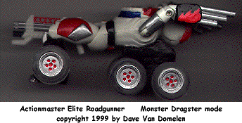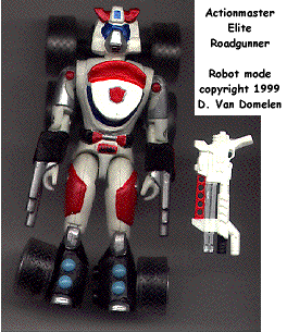 One of the last Autobots to be revived using Nucleon, he was among the first volunteers for the experimental new process which would restore his lost transformation ability. Roadgunner didn't care if the final result would look pretty, he just wanted to get back on his wheels...all six of them. The powerful Nucleon reactors in his body allow him to drive at nearly the speed of sound over flat terrain, and his rugged suspension makes him pretty fast over almost any surface. In robot mode he can use the wheels on his feet as a sort of roller skate, to travel at 75mph, although he prefers not to. It reminds him too much of the time he spent stuck in robot mode. As a robot, he can project flames at his opponents from the exhaust ports on his wrists, an attack he can also use on persistent pursuers in vehicle mode. In both modes he has access to an ion pulse rifle with a range of three kilometers. However, he has to be careful using it while driving, as he sometimes catches up to his own shots!