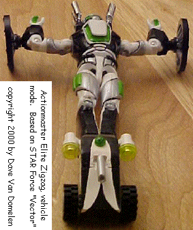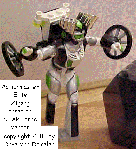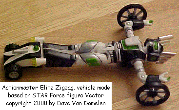 Zigzag is always the first Vehicon to get somewhere...if only it was ever the RIGHT somewhere, the Maximals might be worried. As it stands, this speedy lieutenant usually arrives late in the battle unless carefully directed by his commander. In dragster mode he can reach half the speed of sound in under five seconds, leaving a distinctive stench of burned rubber and exhaust. The laser at his nose is mainly a shock weapon, as his accuracy at speed is almost zero. In robot mode he uses a rocket pack to assist leaps of up to a kilometer at a time, but he's incapable of true flight. The rapidly spinning wheels mounted on his forearms let him punch Maximals so hard that they almost fly over the horizon. In either mode, if in need of a hasty escape, Zigzag can emit a dense, noxious smokescreen from the tailpipes mounted to either side of his head.